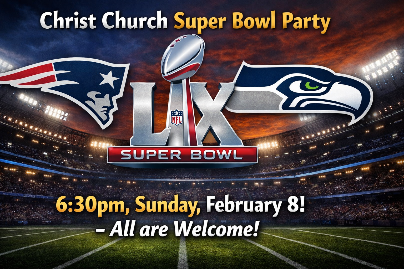 The Big Game starts at 6:30pm and we are having a chilifest (and other food as well). Bring your own chili for the competition with winners for "Best", "Hottest", and "Most Unexpected". Winners will receive an official Christ Church Pint Glass. If making chili is not your thing, bring your favorite game day dish, beer, or wine. Or make a donation of $20 to the Church to help cover the costs. We will have a selection of beer, wine, soda and snacks - donations are appreciated.